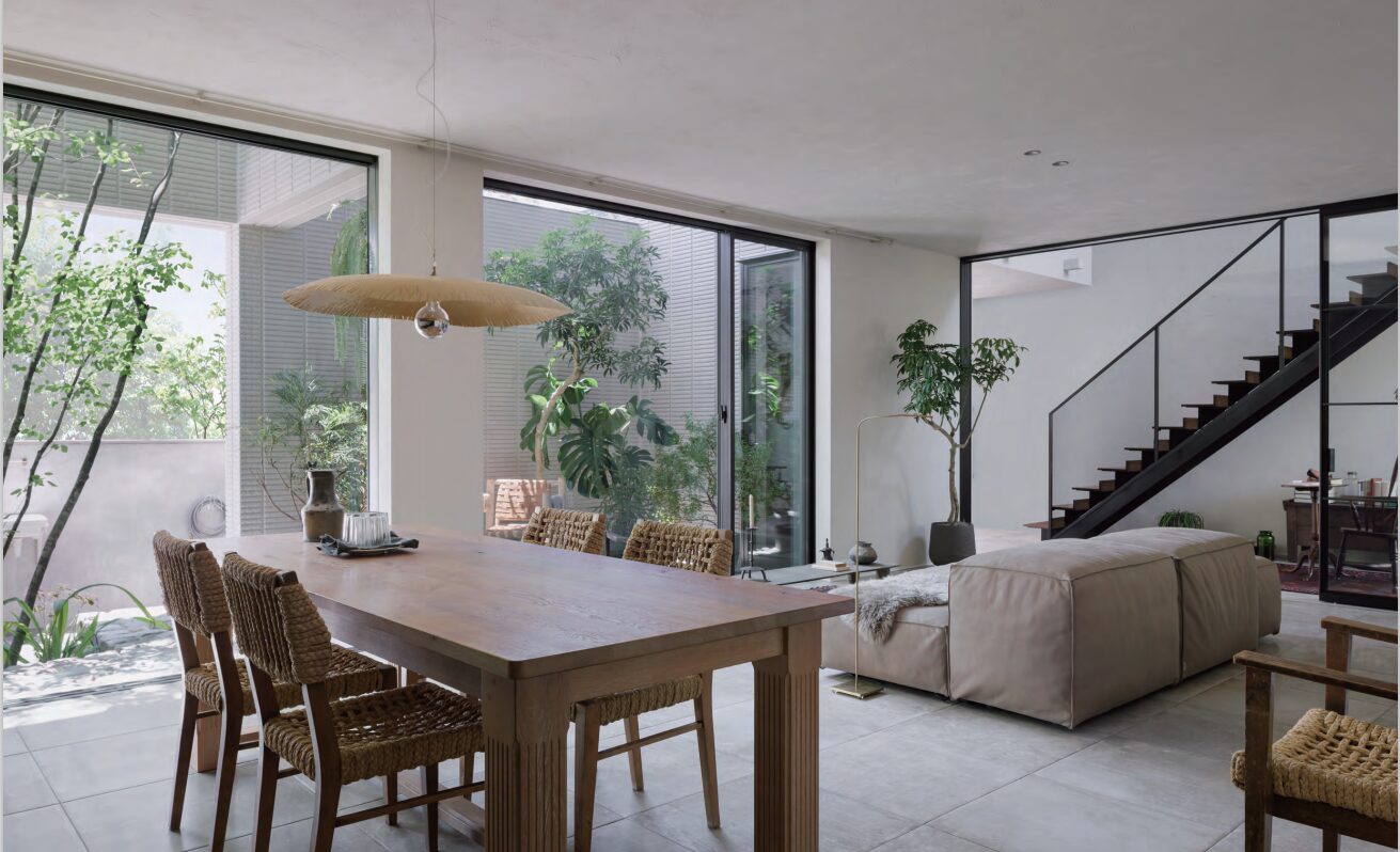吹き抜けの開放感、光の入り方、素材の静かな美しさ——