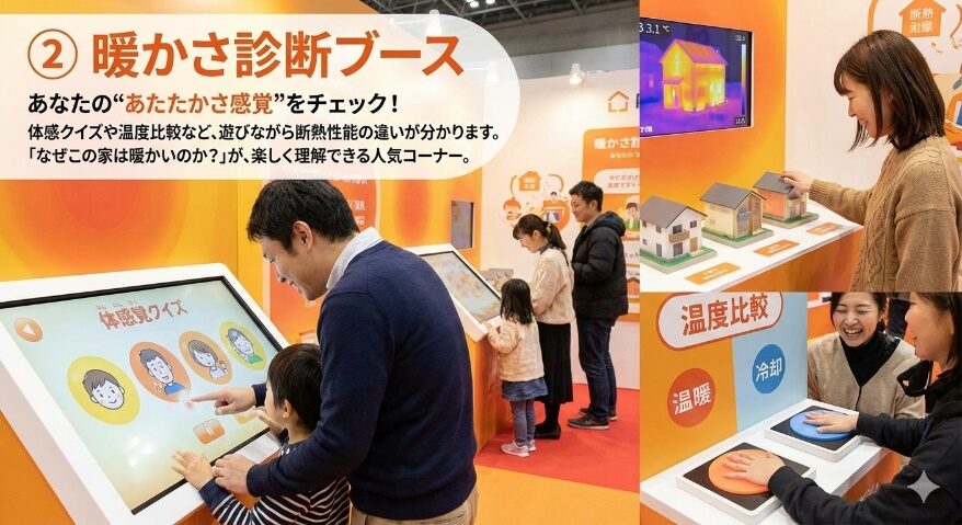 体感クイズや温度比較など、遊びながら断熱性能の違いが分かります。