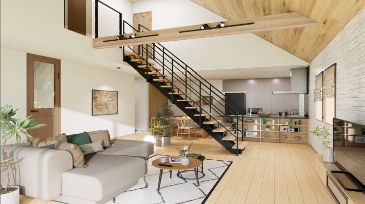 一例として、勾配天井でつながったLDKプランでは、従来よりも縦・横・奥行とも広さを確保し、光と視線が抜ける空間を創出します。