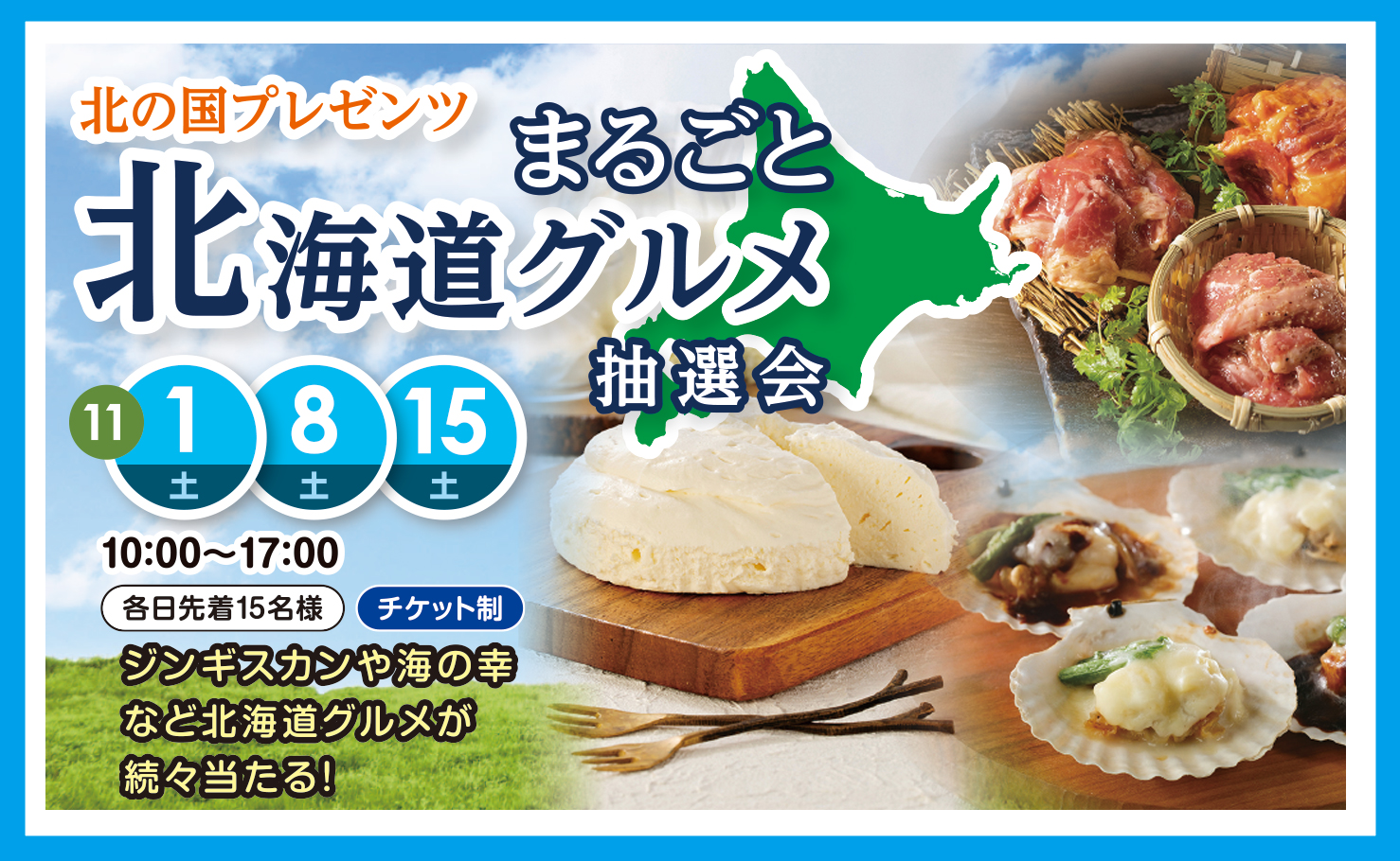【2025年11月1日(土)・8日(土)・15日(土)】まるごと北海道グルメ抽選会 2025年10月28日 最終更新日時 : 2025年10月29日 child ジンギスカンや海の幸など北海道グルメが続々当たる! ●日程:11/1(土)・11/8(土)・11/15(土)●時間:10:00~17:00●参加:各日先着15名様・チケット制