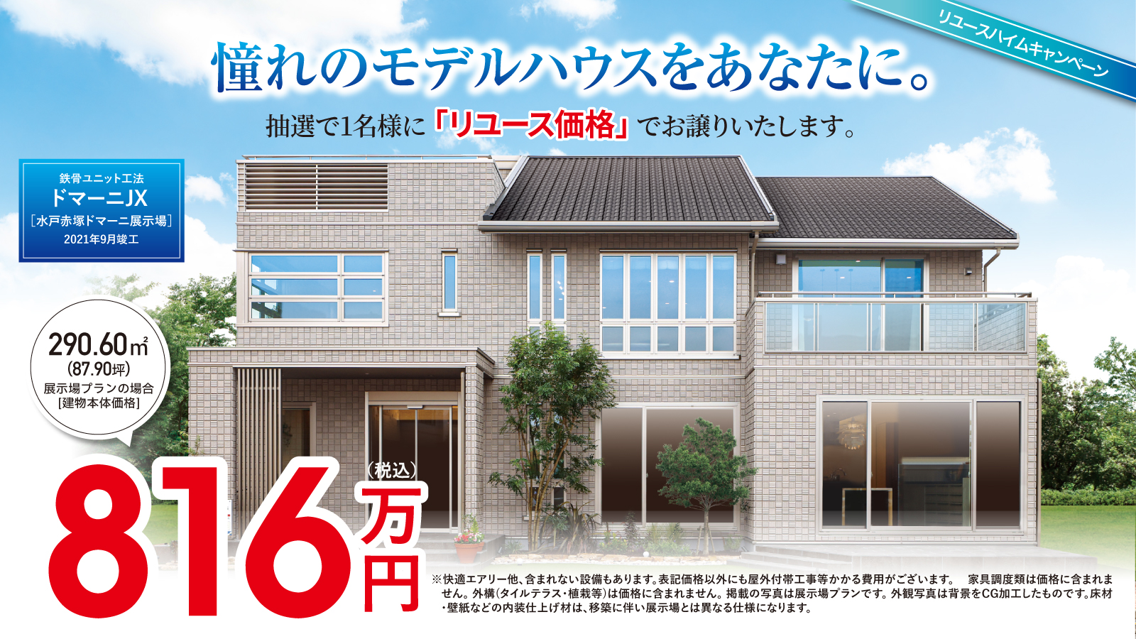 ドリームハイムchanceとは、展示場モデルハウスを抽選で1名様に特別価格でお譲りするキャンペーンです。